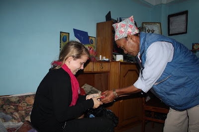 Siden Benedicte hadde fått et nepalsk navn, bestemte vi oss for å fortelle distriktslederen at vi hadde gitt han et norsk navn. Han så ganske bekymret ut, men da vi fortalte ham sitt norske navn, ”Bestefar” holdt han på å dette av stolen av latter uten at han visste hva det betydde. Det han fikk vite betydningen lo han bare enda mer.
